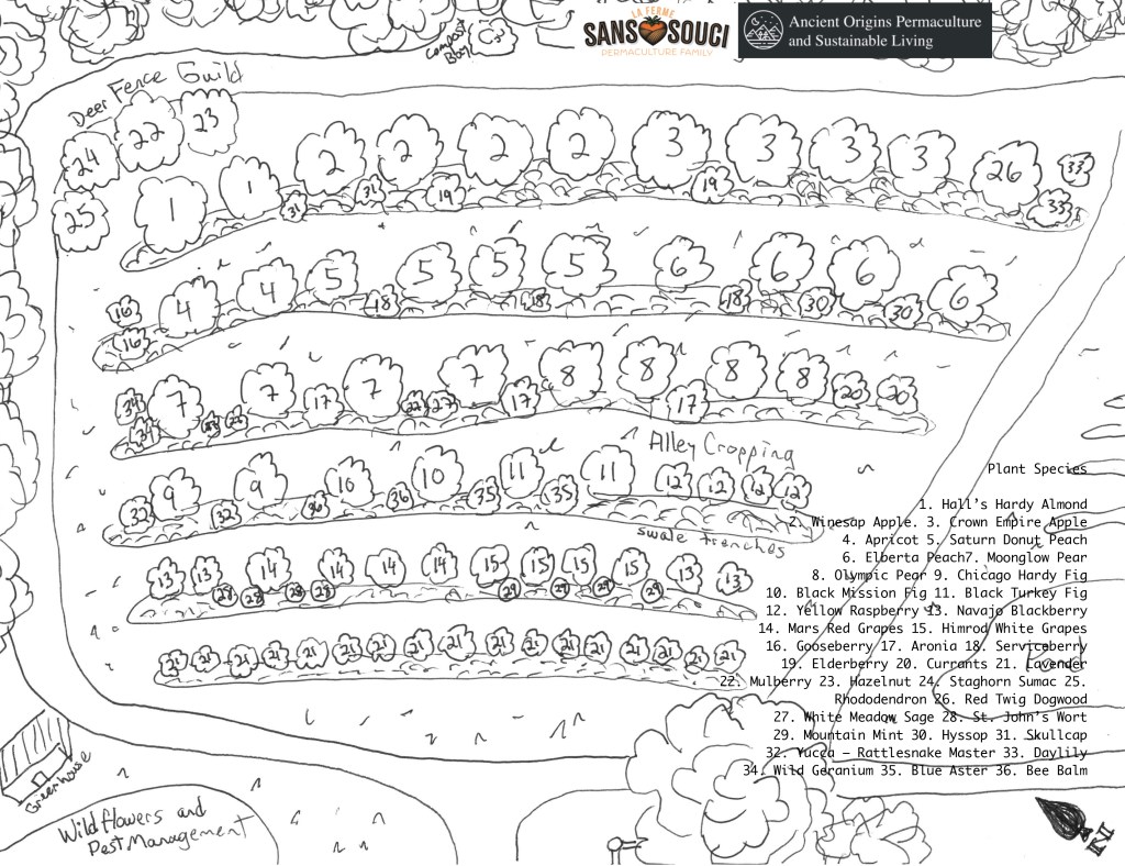 Tyler from Ancient Origins Permaculture finished installing the guild trees—99 trees and polyculture companions—set across 600 feet of swales carved by hand into a surface of stubborn clay. The berm-and-basin swales, built from thirty-six yards of mushroom and leaf compost, will begin the long work of regenerating the soil. Seven yards of river stone are in place to catch and hold water once everything is established.