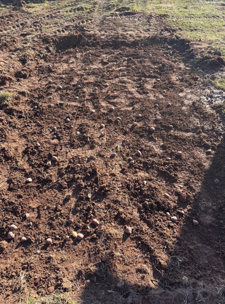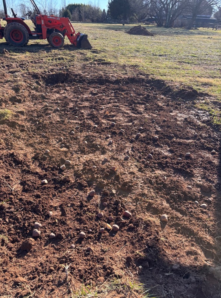 On the second day, we planted two varieties of potatoes in the footprint I had dug out for the greenhouse. We decided not to move the greenhouse and instead used the 6” cut out to place cut Irish Cobbler and Red Viking potatoes procured online from Hoss. After spacing the pieces in two sections I covered the entire 10’ x 14’ with a healthy layer of the black compost we recently relocated from the annual garden. It is also on my list to rebuild the large composting station with three bays to keep material advancing through stages.